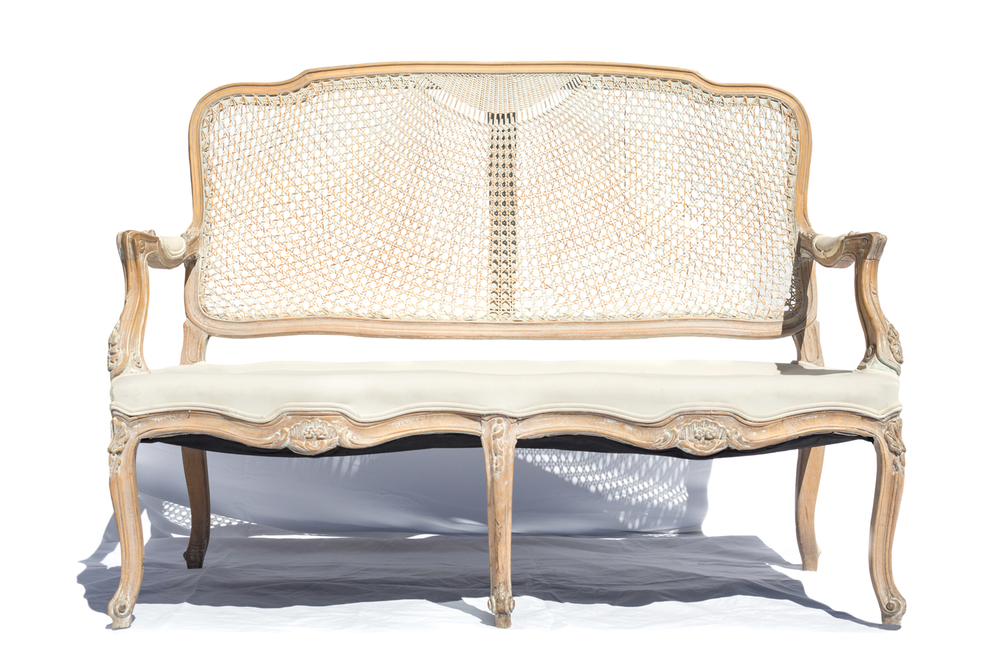 Description: This sofa has an ivory cushion with a off-white cane back. It is delicate and one of a kind.