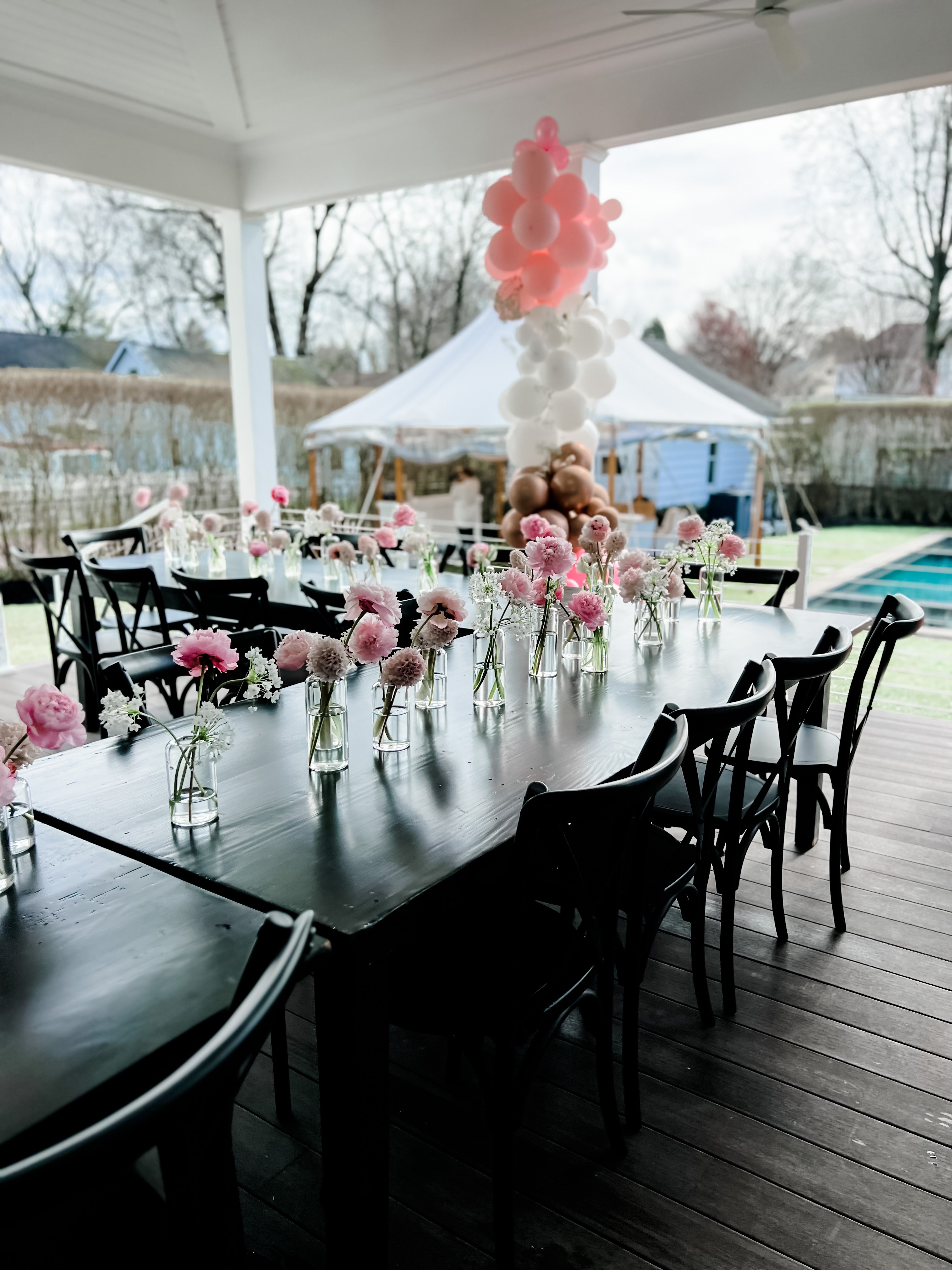 Description: Black wooden crossback chairs. They pair perfectly with our black farm tabes!