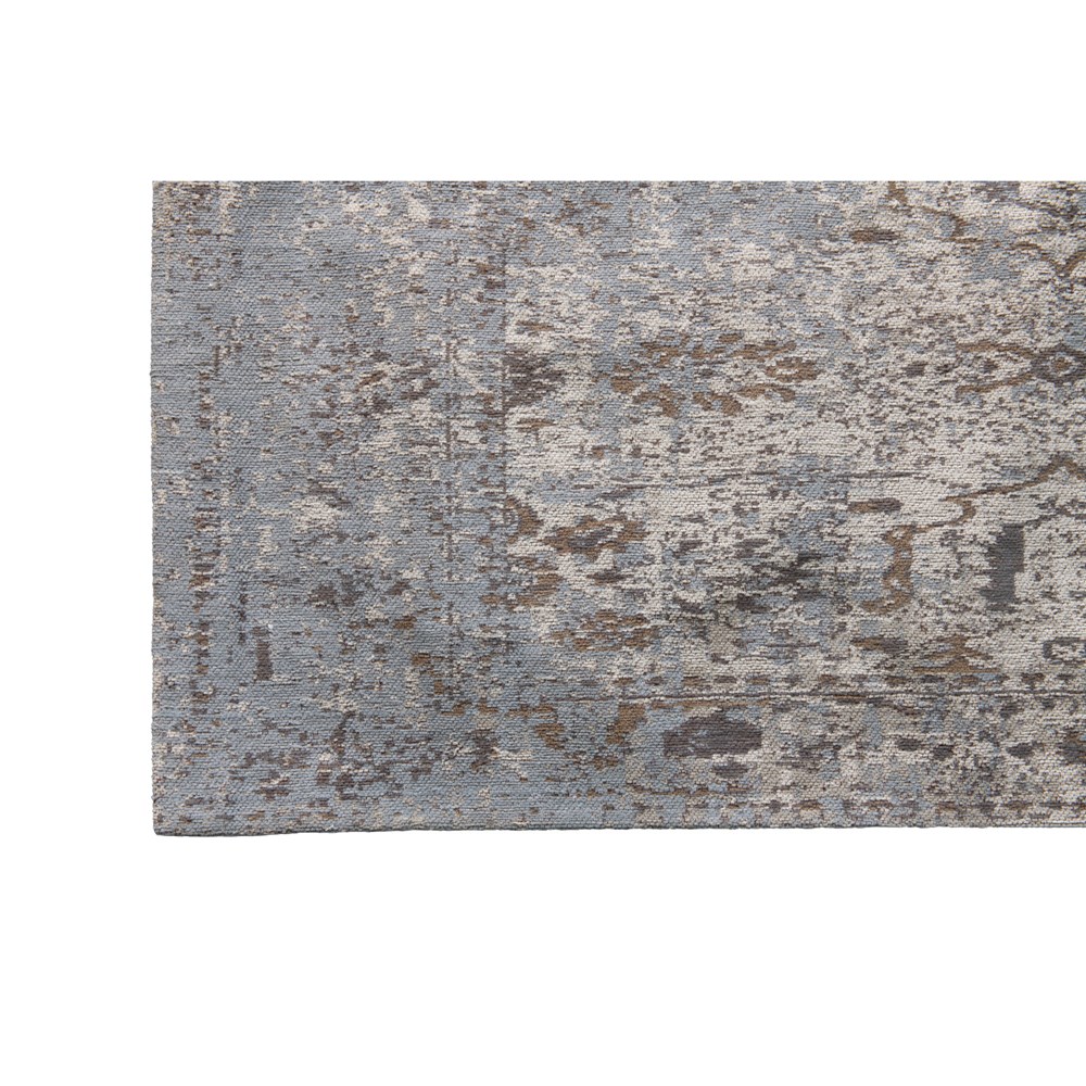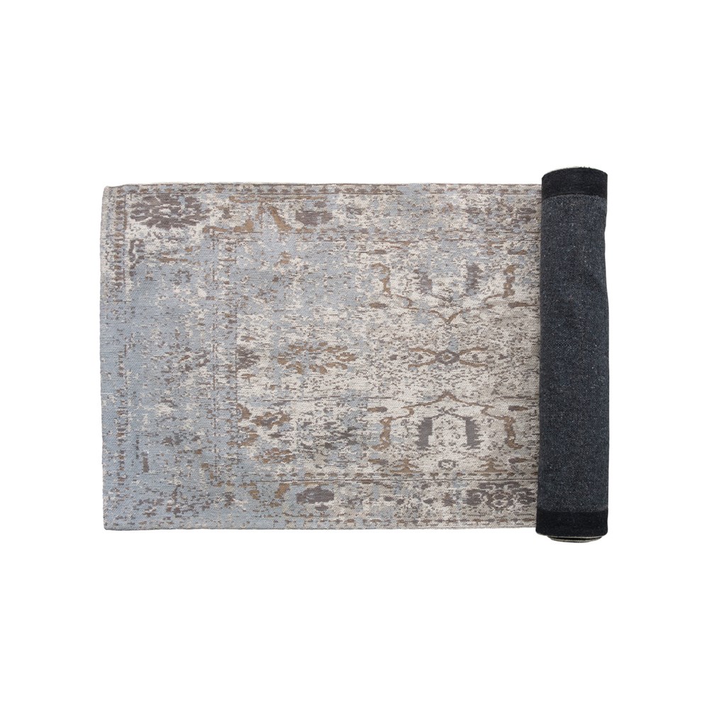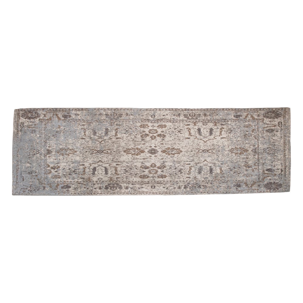 Description: 2.5' x 8' Woven Cotton Runner, Distressed tones with blue and brown accents