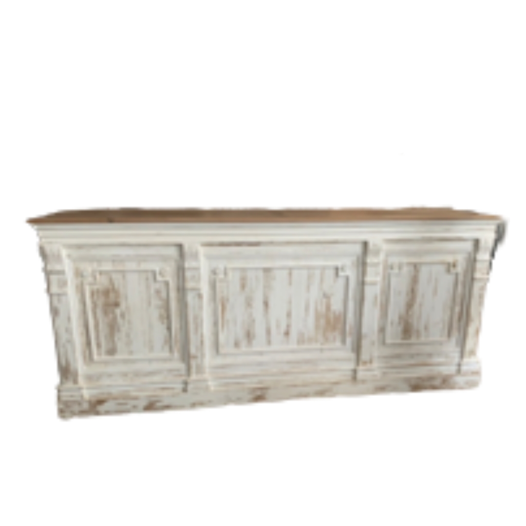 Description: Camille is the perfect distressed bar with a natural wood top.