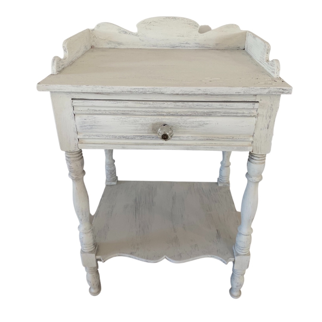 Description: Carolyn is a white wash beauty! Features a shelf on the bottom and drawer with glass knob. The possibilities are endless with her.