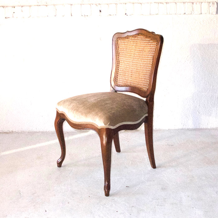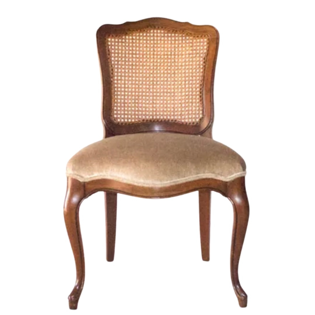 Description: Chanterelle chairs are a pair or can be rented separately. They are a light brown or mushroom color with a cane back.