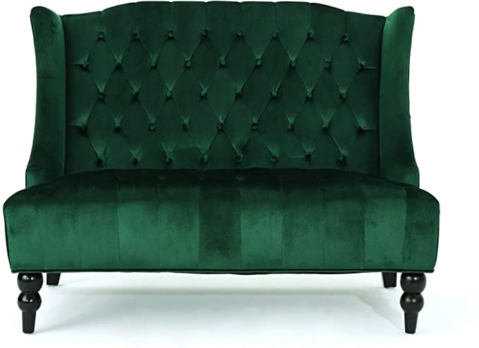 Description: Emerald velvet loveseat.