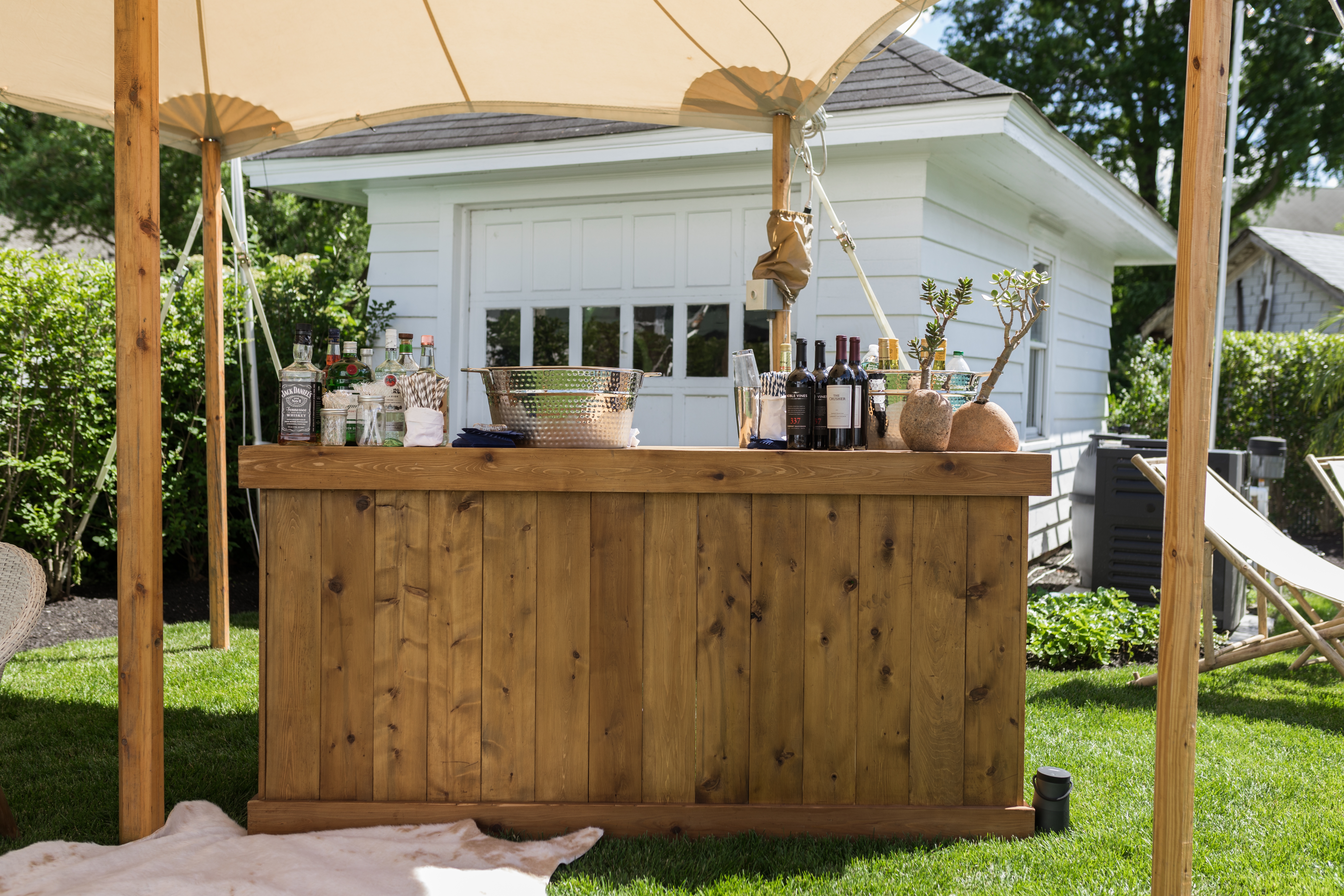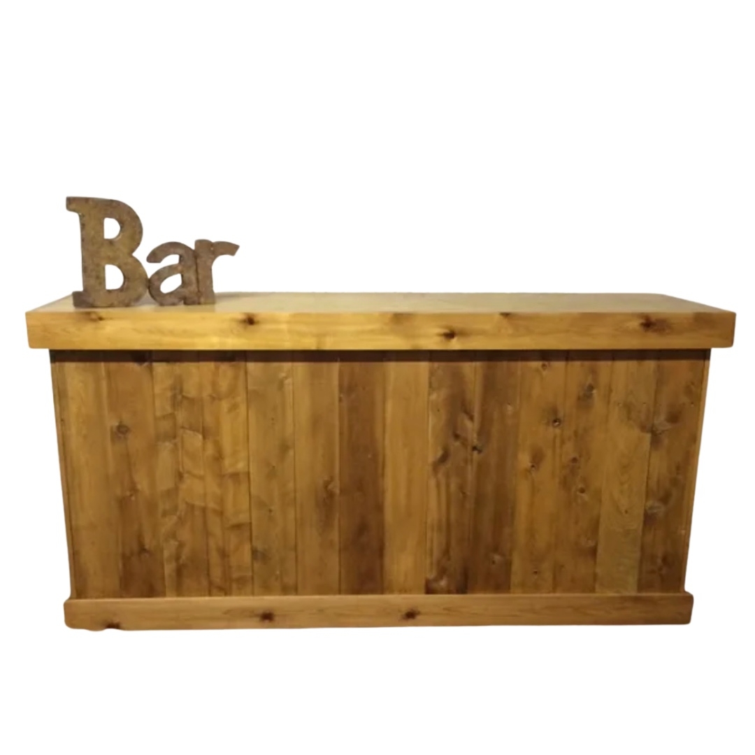 Description: Our Collins bar is perfect for your rustic needs. A shelf is along the backside to store glasses and all your extra items. Bar sign not included but available for rent!