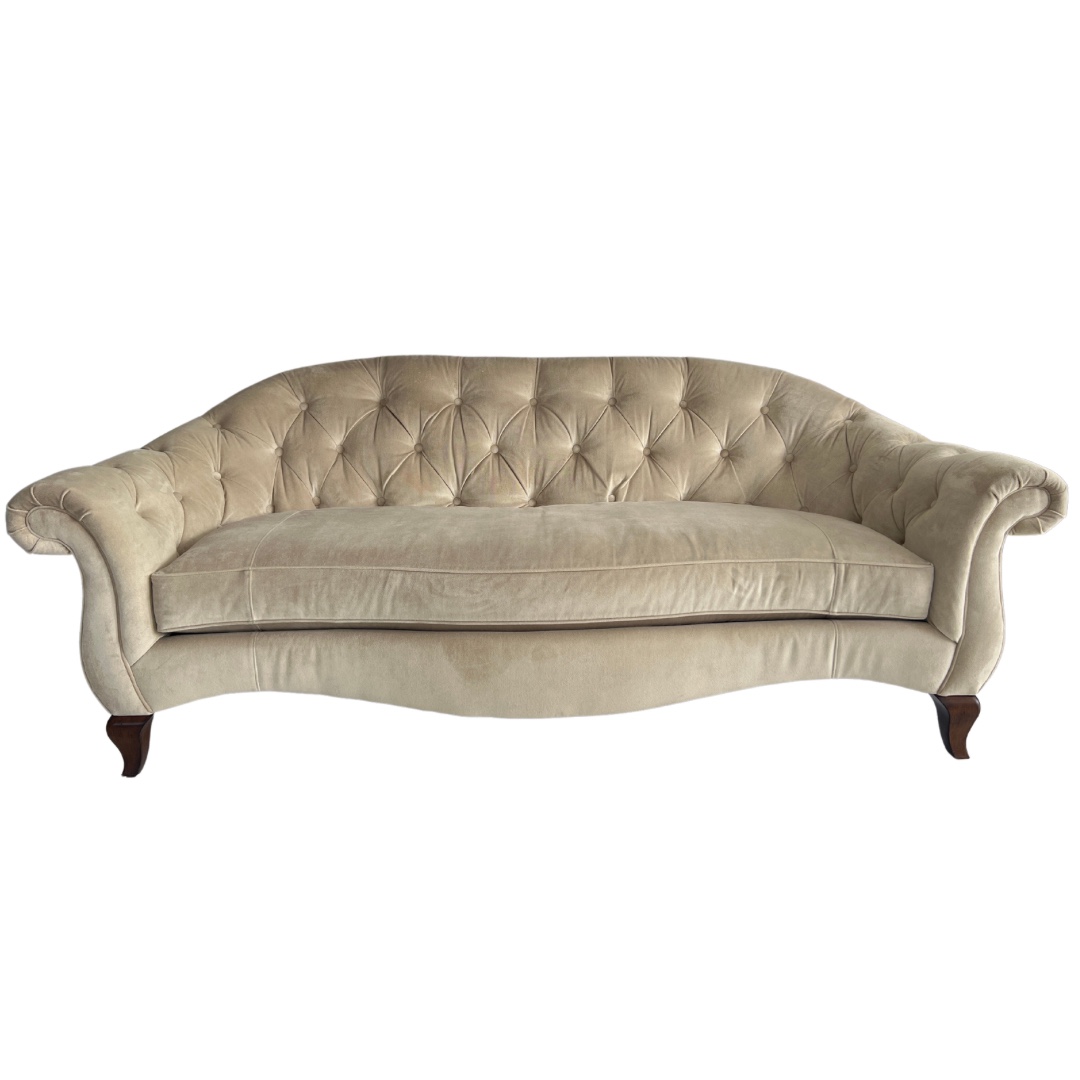 Description: Gorgeous Ivory velvet tufted sofa with wooden legs.