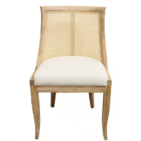 Description: Eloise has breezy woven back, plush seat, and classic French design that’s both fresh and enduring. Whitewash finish with white linen cushion.