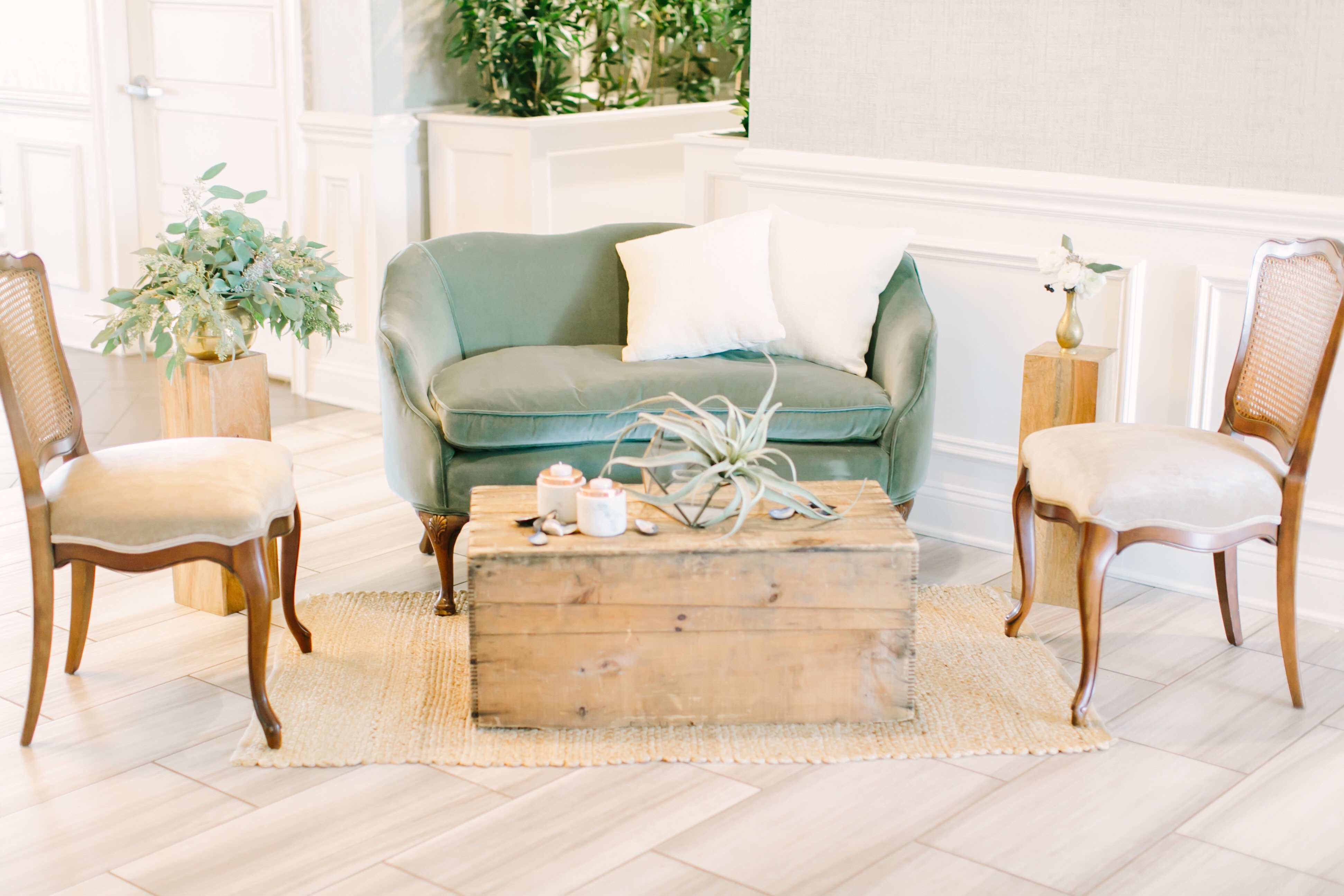 Description: Evelyn is the perfect small lounge for an event! Please note that the rug in the photo has changed to a circular one. Florals and small accent not included.