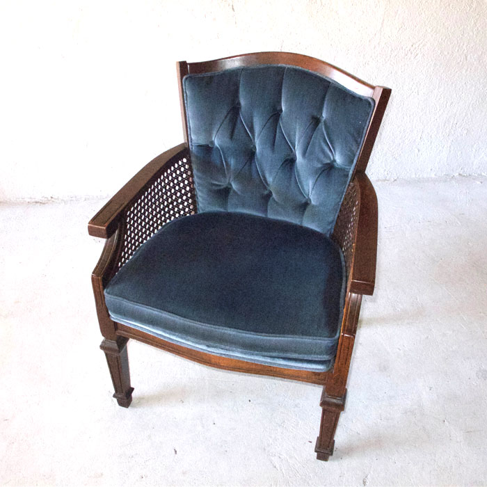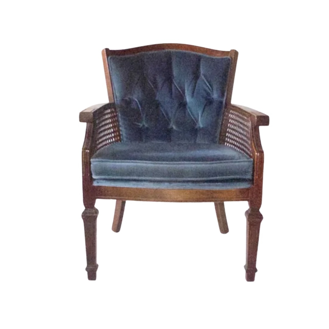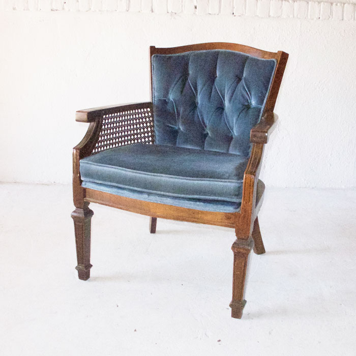 Description: Everest is a blue/grey velvet arm chair with cane side detailing.