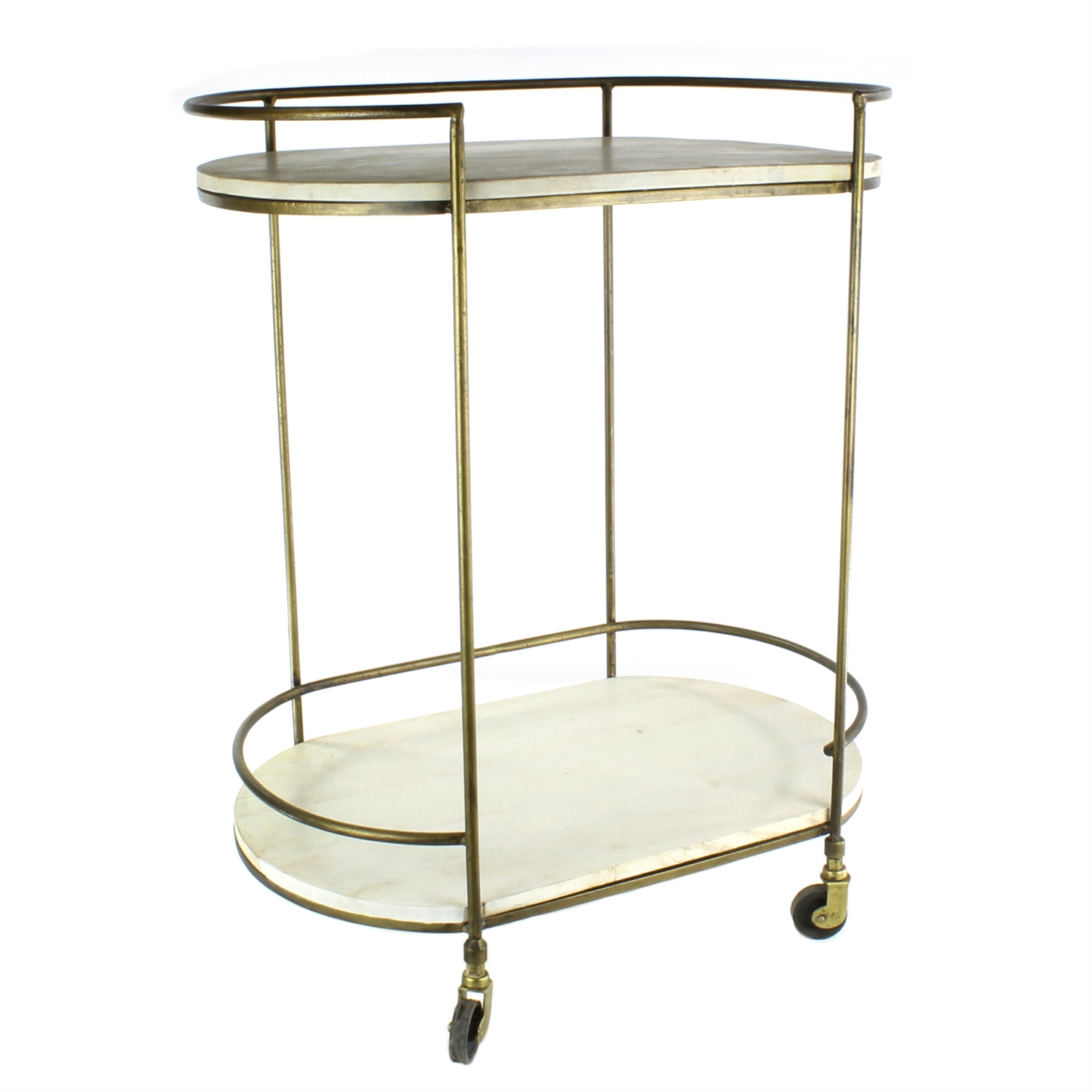 Description: With our Gibson Bar Cart, you can take the party to the party. Wood shelves on top and bottom provide plenty of space for glassware and bottles while the simple and elegant iron frame in an oval silhouette gleams with an antique brass finish that adds a dash of nouveau style.