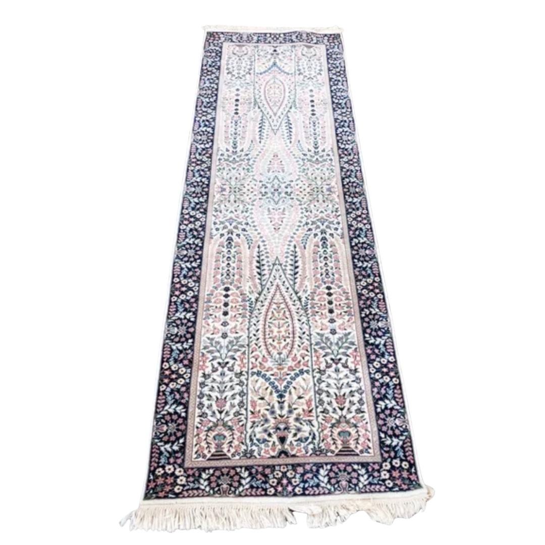 Description: The runner is part of the Harriet collection. The runner is 60 inches by 28 28 inches and features hues of pink, ivory and navy blue.