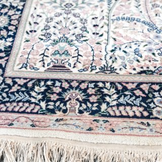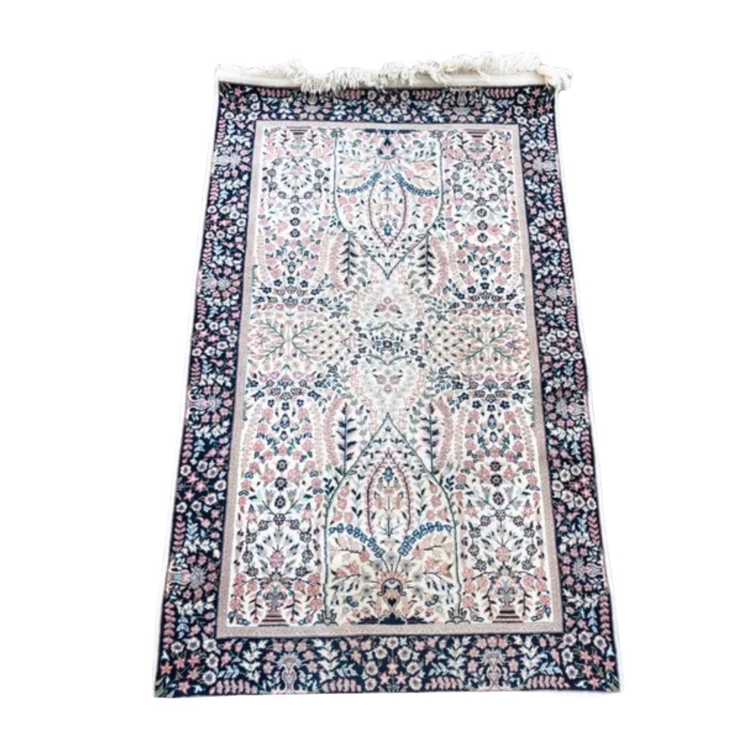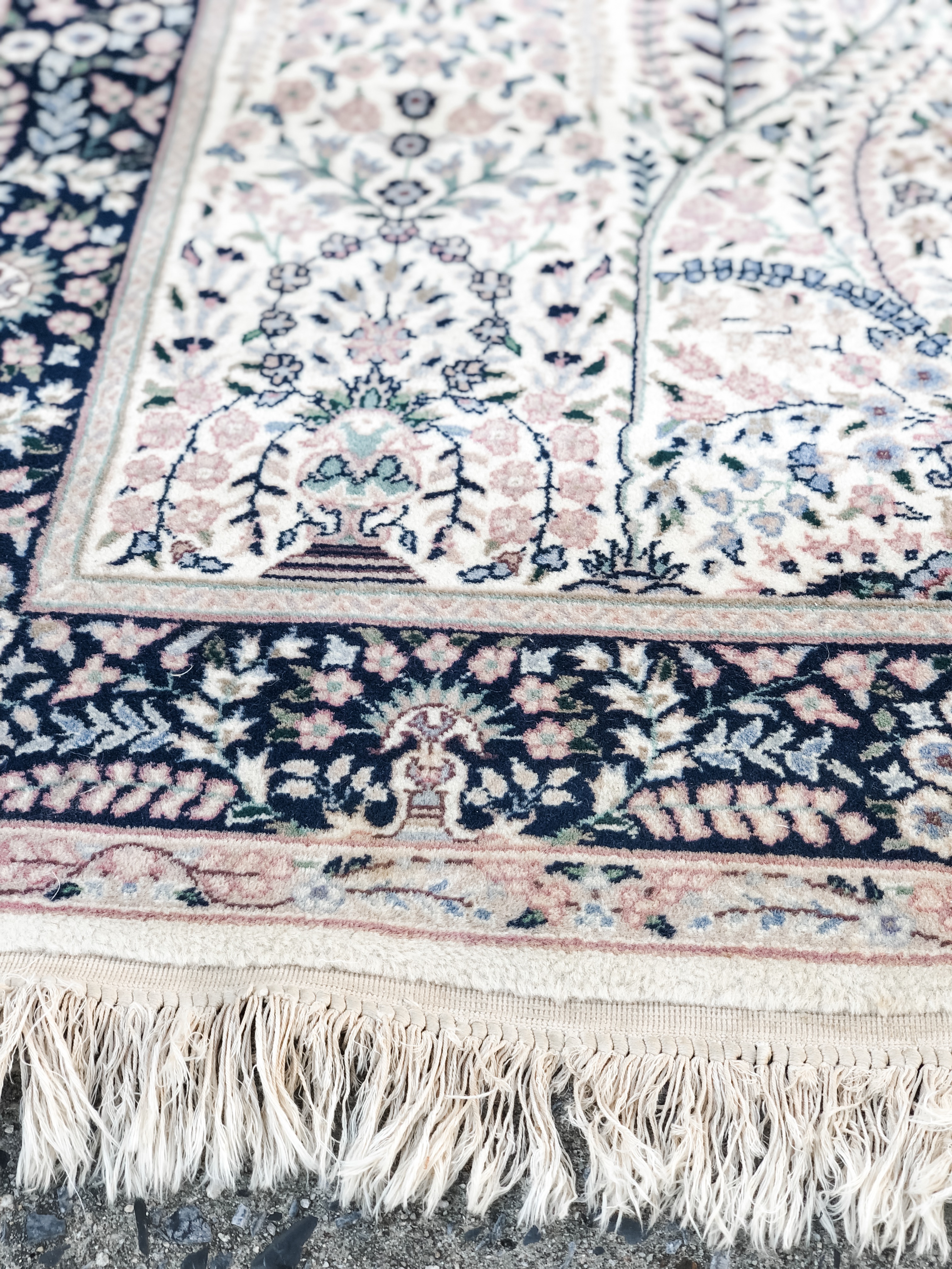 Description: The runner is part of the Harriet collection. The runner is 33.5 inches by 60 inches and features hues of pink, ivory and navy blue.