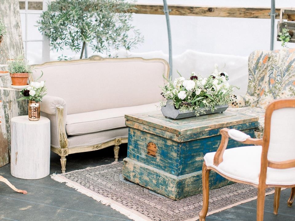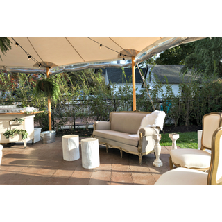 Description: This lounge is the perfect depiction of French garden chic. This lounge sits 6 comfortably. Florals are not included.