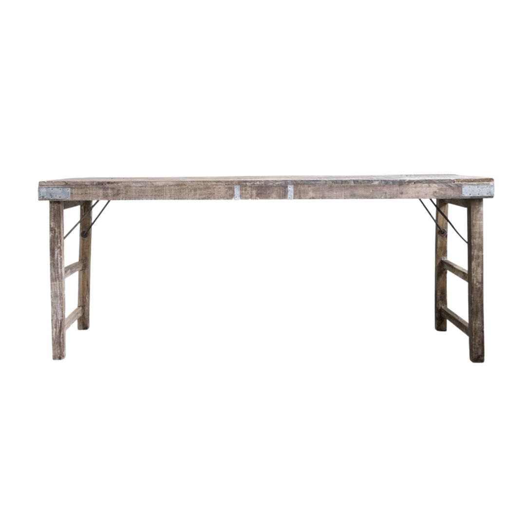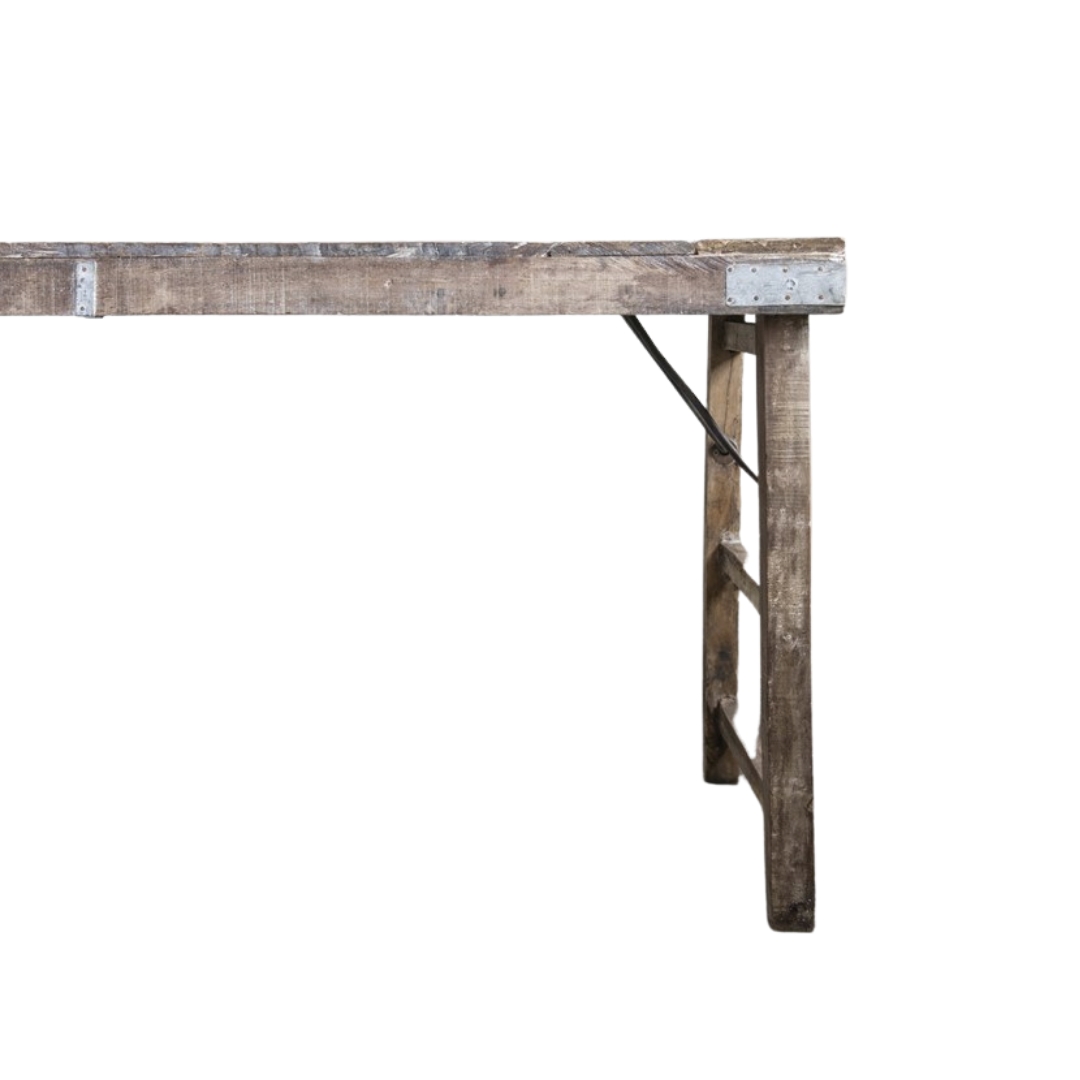 Description: 68"L x 22"W x 31"H Reclaimed Wood Folding Table w/ Tin Patches.