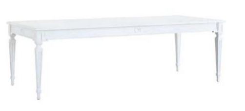 Description: A traditional style farm table with elegant detailing. White wash finish. 8 ft.