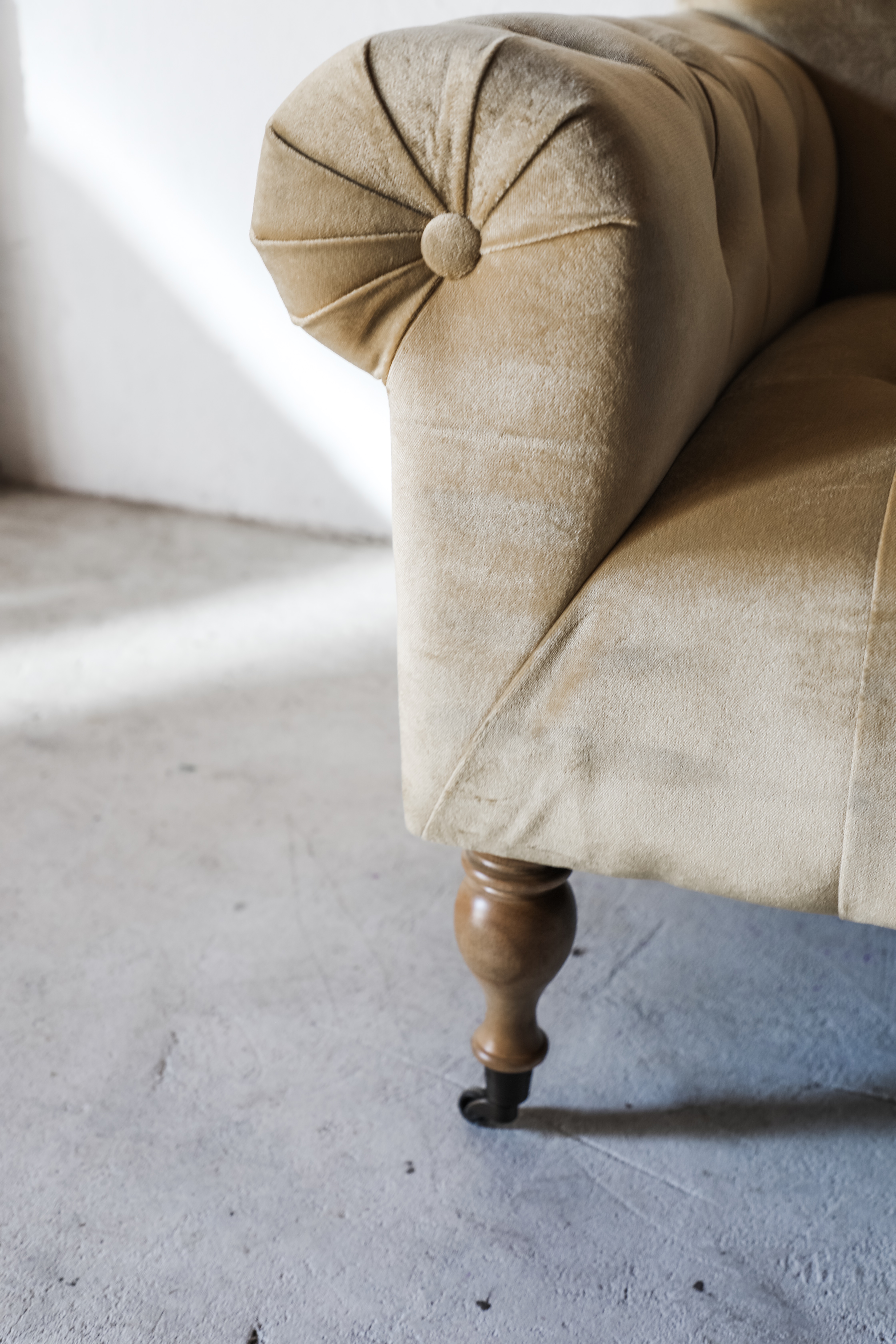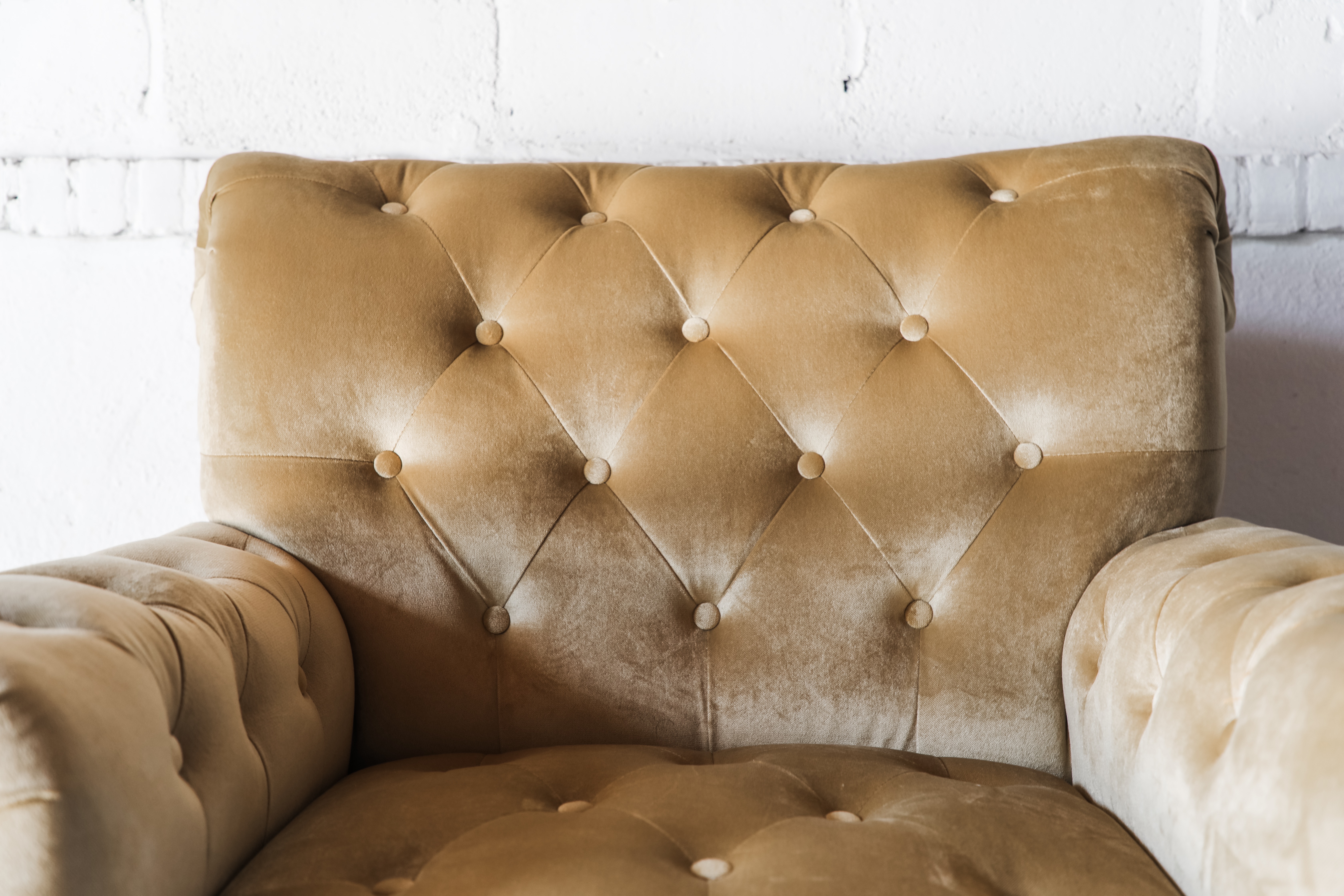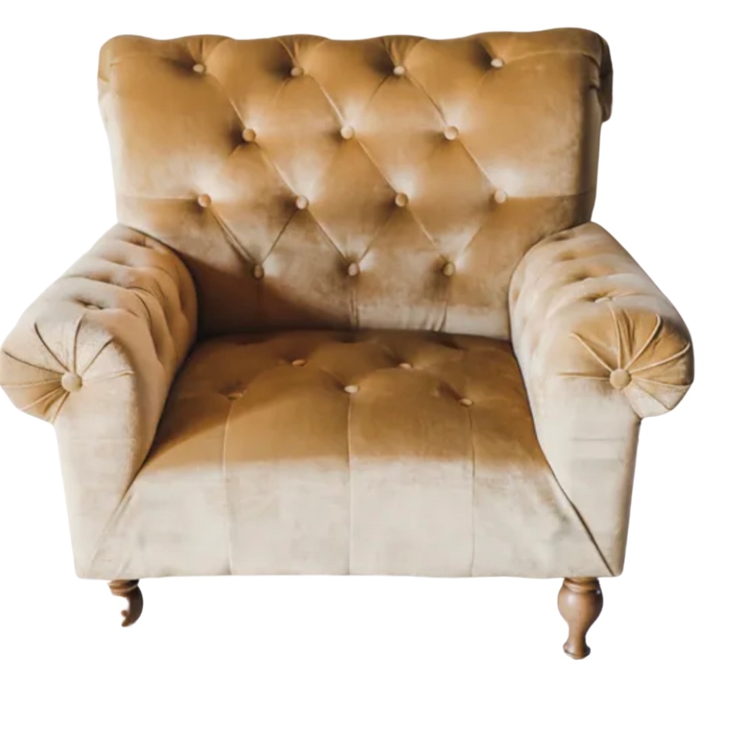 Description: This pair of golden velvet tufted chairs are perfect for any lounge or seating area. These chairs are oversized and extremely comfortable!