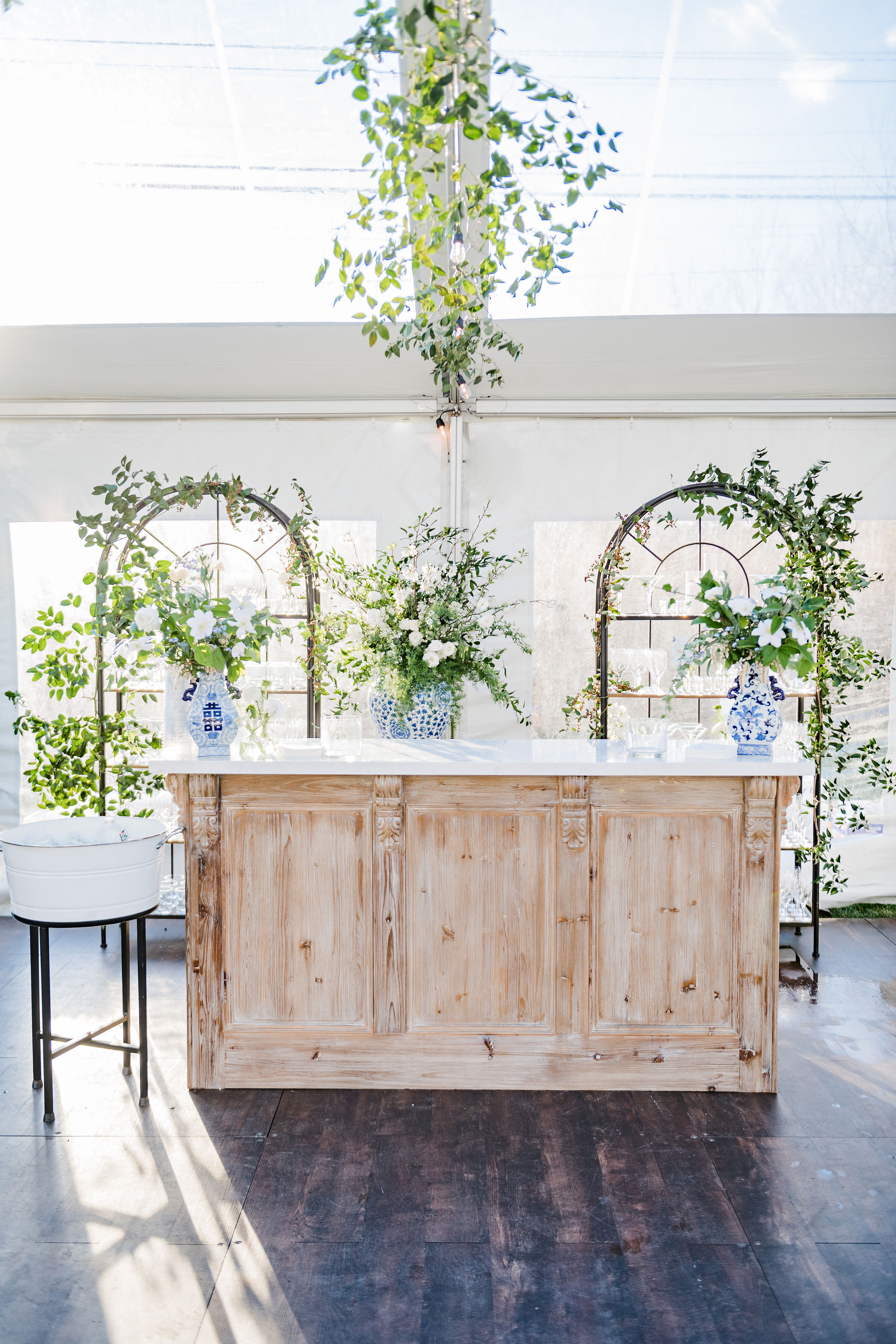Description: Our Penelope bar is beautiful with a white wash finish. It's perfect for any event! We have 4 total so you can create custom sizes based on your needs.