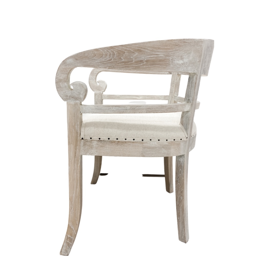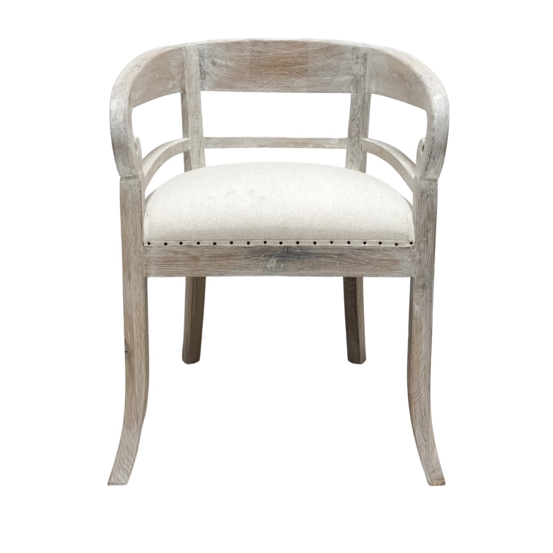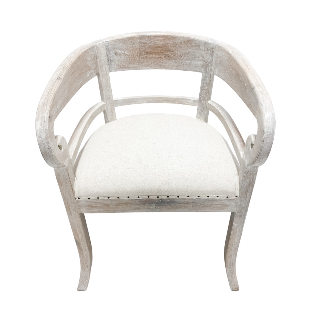 Description: Polly boasts a beautiful white oak wood with ivory linen seat. She has unique detailing on the side and is perfect for a sweetheart table, intimate dinner party or in a lounge.