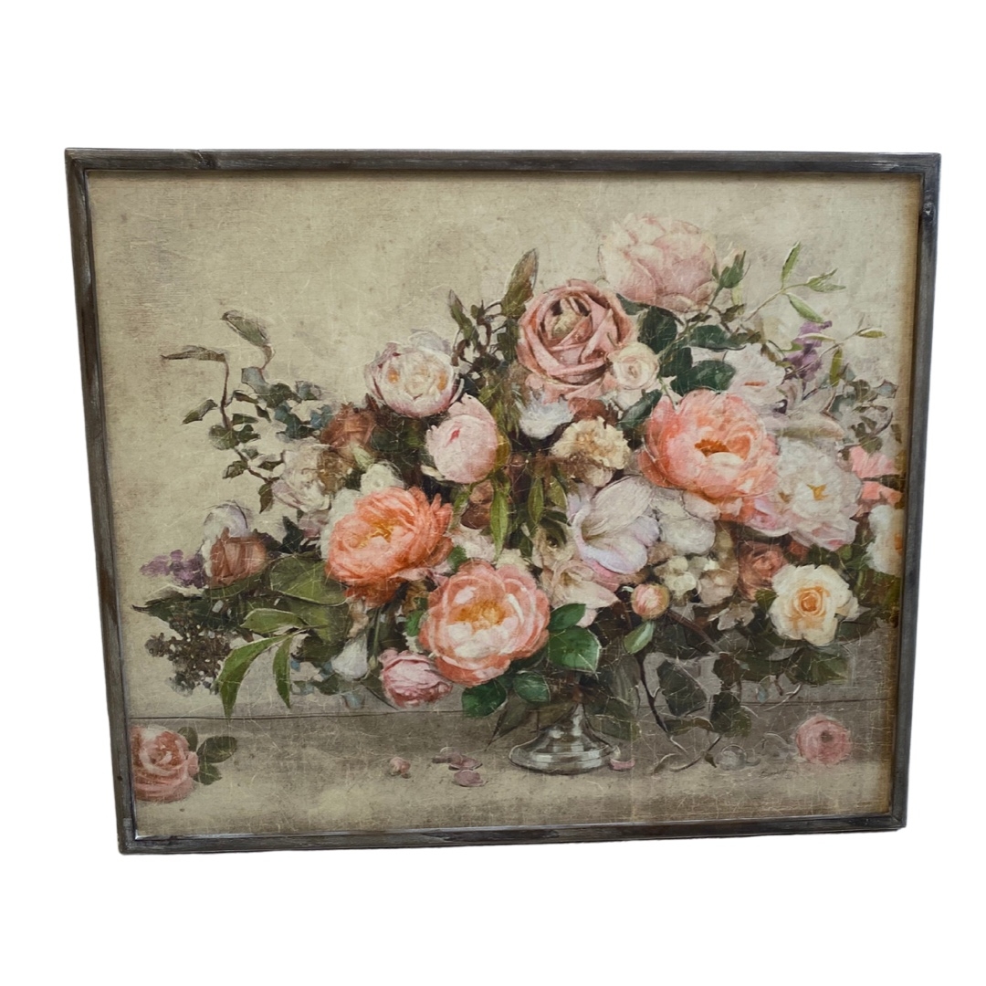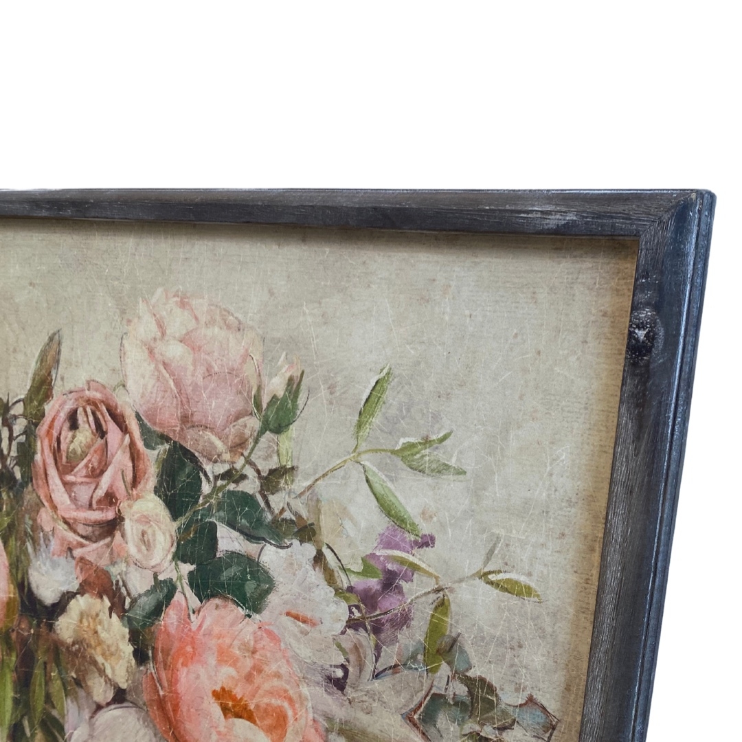 Description: Beautiful floral art print in a weathered oak frame. Can be attached to a wall or stood against a wall or surface.