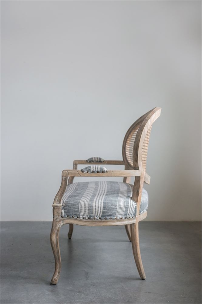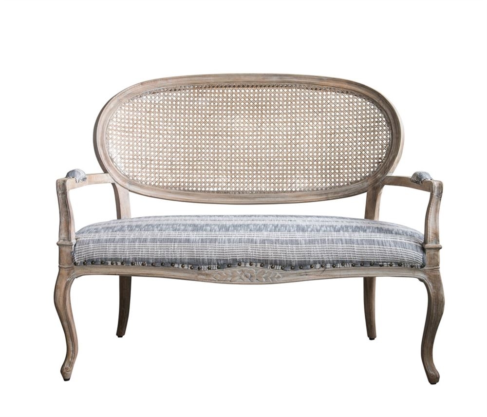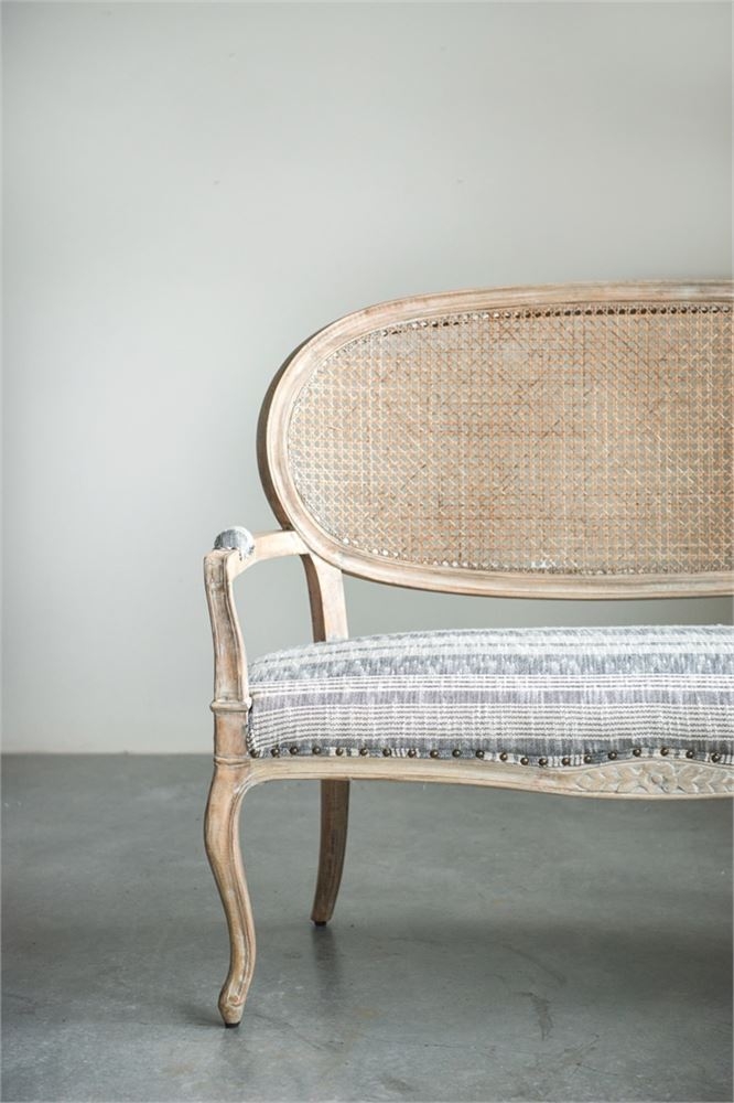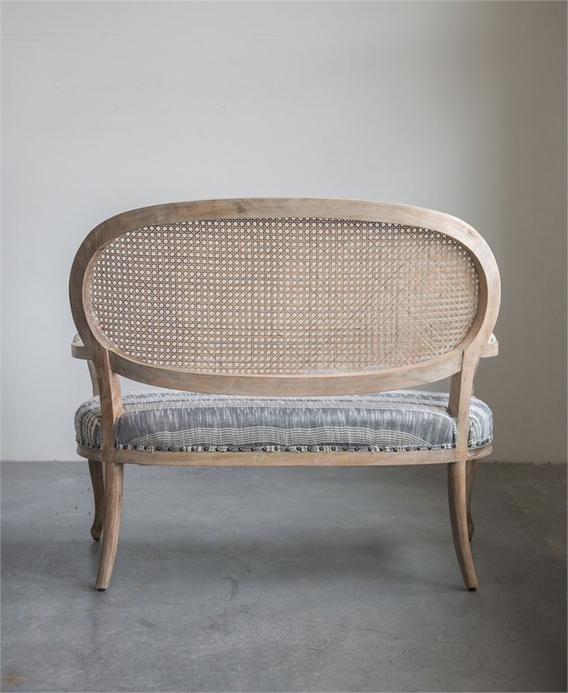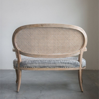 Description: Our Light Wood Settee w/ Cane Back & Woven Fabric is perfect for your lounge or sweetheart table!