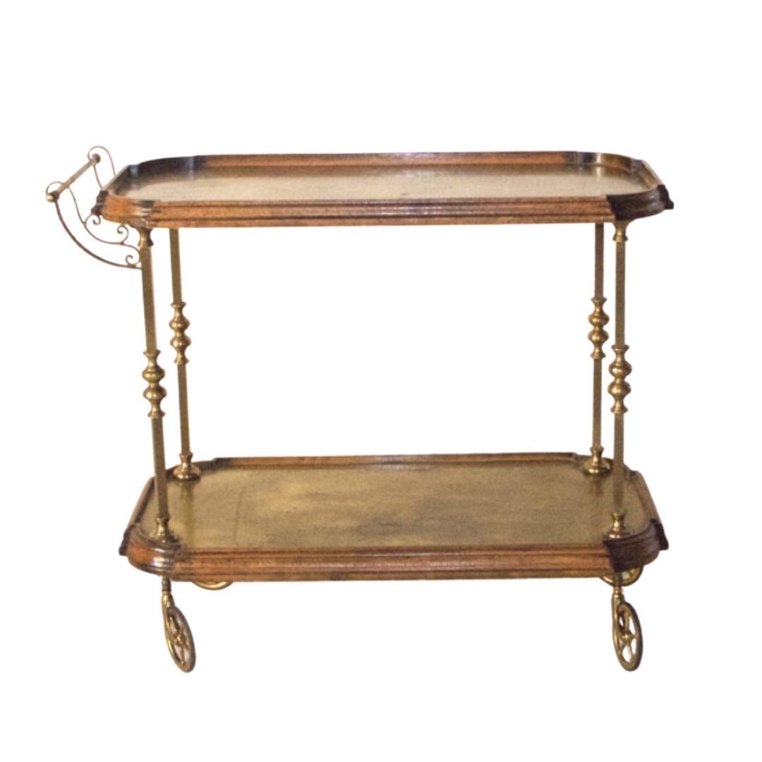 Description: a beautiful wooden and brass bar cart with just the right amount of patina.