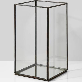 Description: A burnt antique metal frame holds four clear glass panels on this square lantern. A mirrored bottom panel adds a reflective surface to this lantern that has a beautiful, clean shape and look. Fill the lantern with pillar candles to line a wedding ceremony aisle; or put the lantern on your reception table as a non-floral centerpiece surrounded by smaller votive holders.