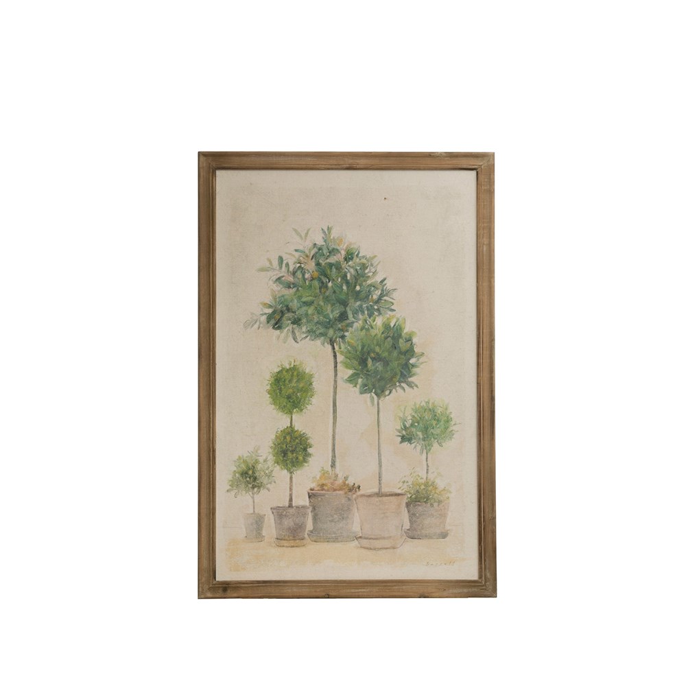 Description: Wood Framed Wall Decor w/ Boxwood Topiary in Pots